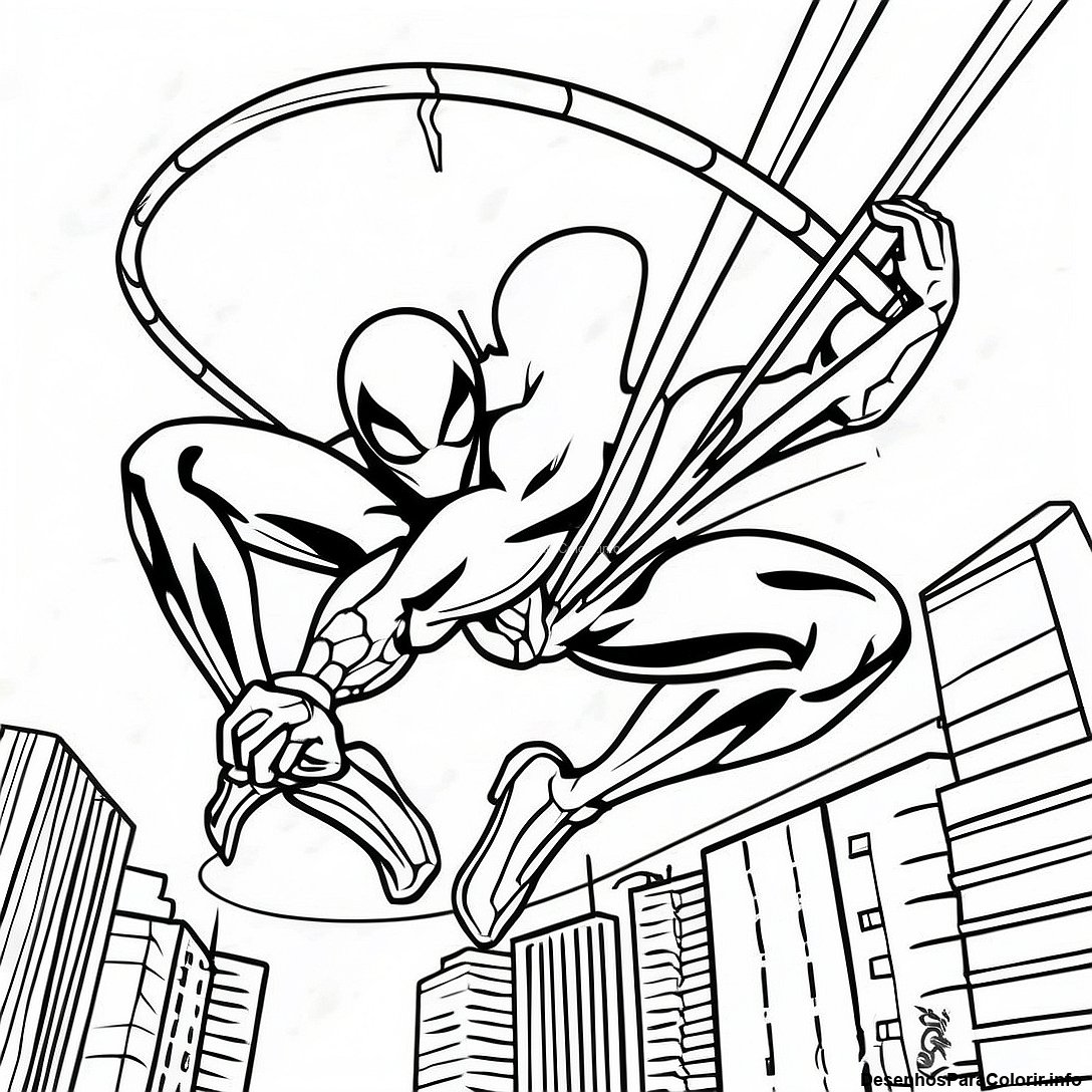 Página Para Colorir Da Aranha De Ferro Balançando Pela Cidade