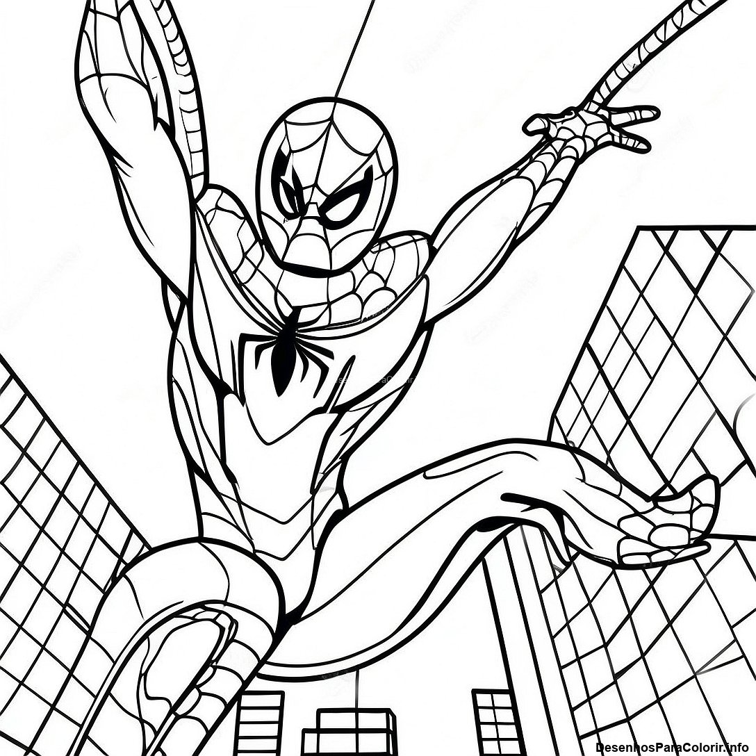 Baixar PDF Imprimível de Página Para Colorir Da Aranha De Ferro Balançando Pela Cidade