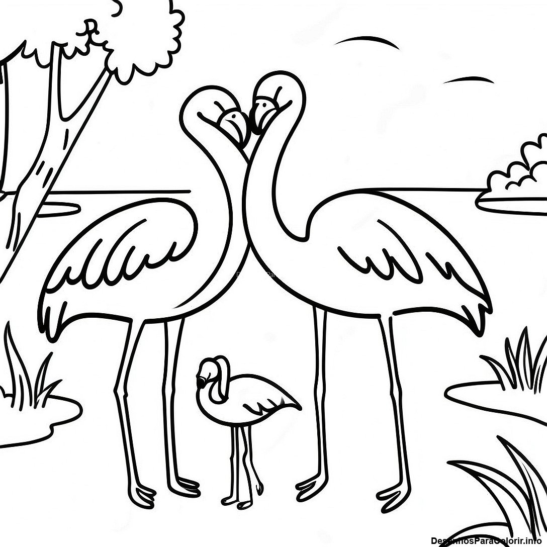 Baixar PDF Imprimível de Página Para Colorir Da Família De Flamingos Ao Lado Do Lago
