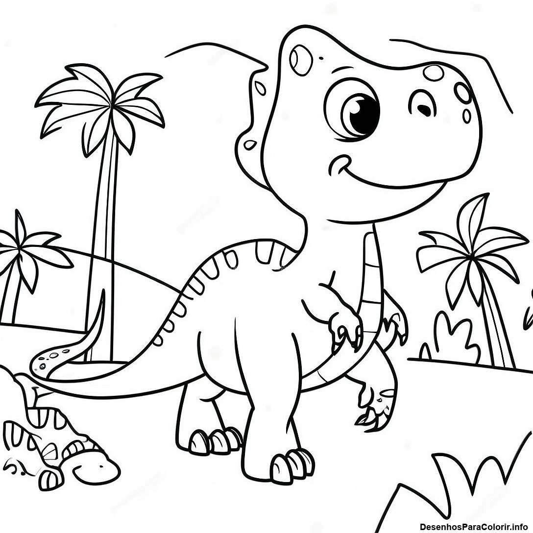Página para Colorir de T Rex Feliz Brincando com Amigos