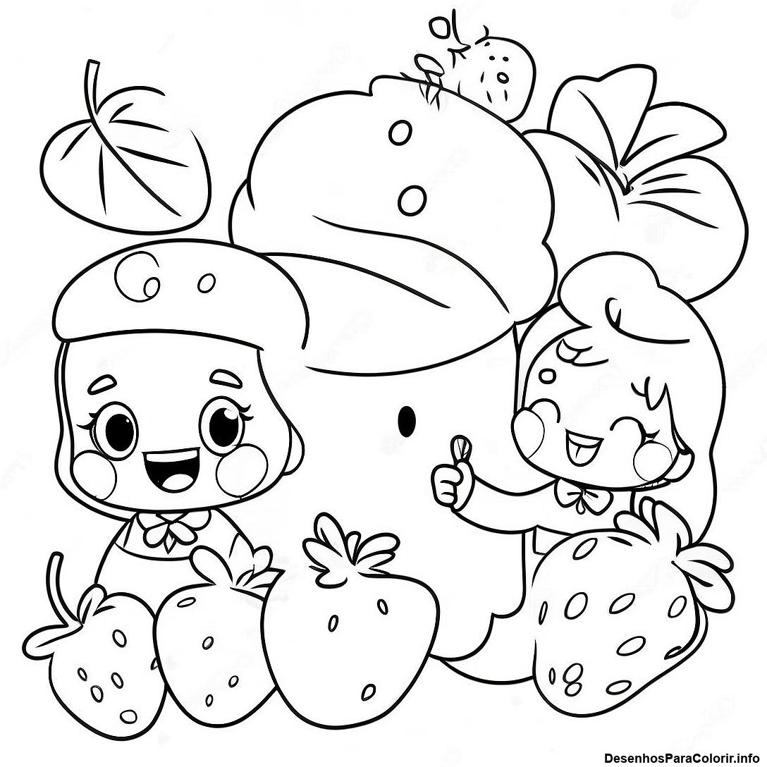 Baixar PDF Imprimível de Página Para Colorir De Bolo De Morango Feliz Com Amigos