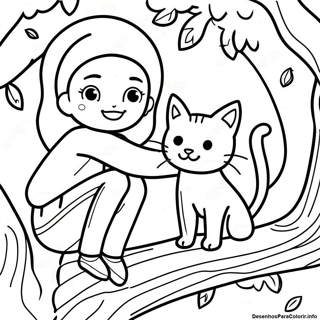 Baixar PDF Imprimível de Página Para Colorir De Menina Aventureira Com Gato Em Uma Árvore
