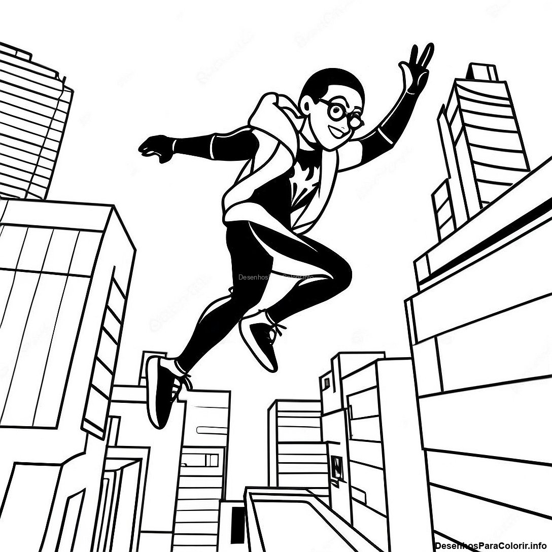 Página Para Colorir Do Miles Morales Pulando Sobre Prédios